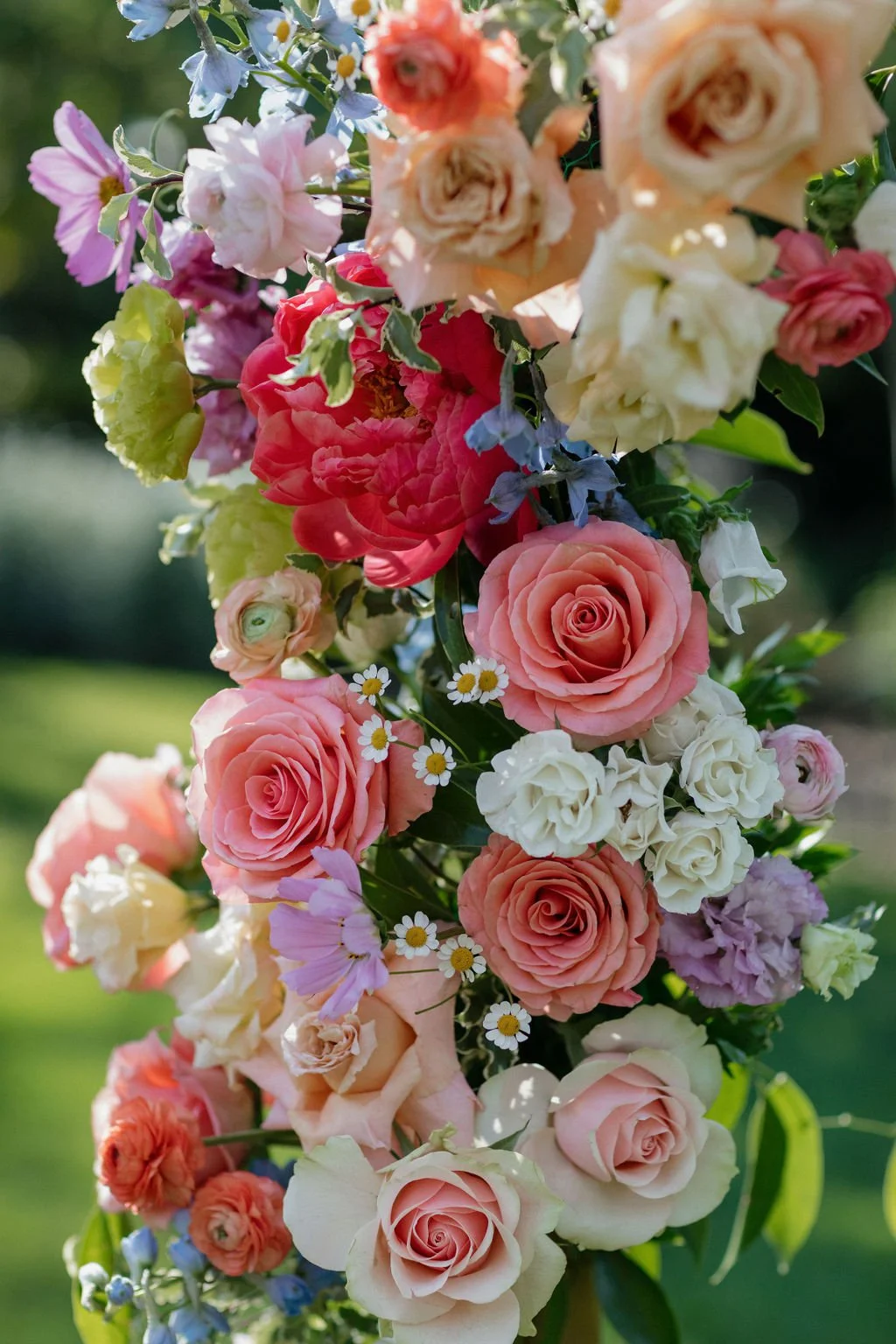 Glass bud vases, delicate floral stems “growing” from the tables, and a simple circular arch created an airy, laid-back garden feel.