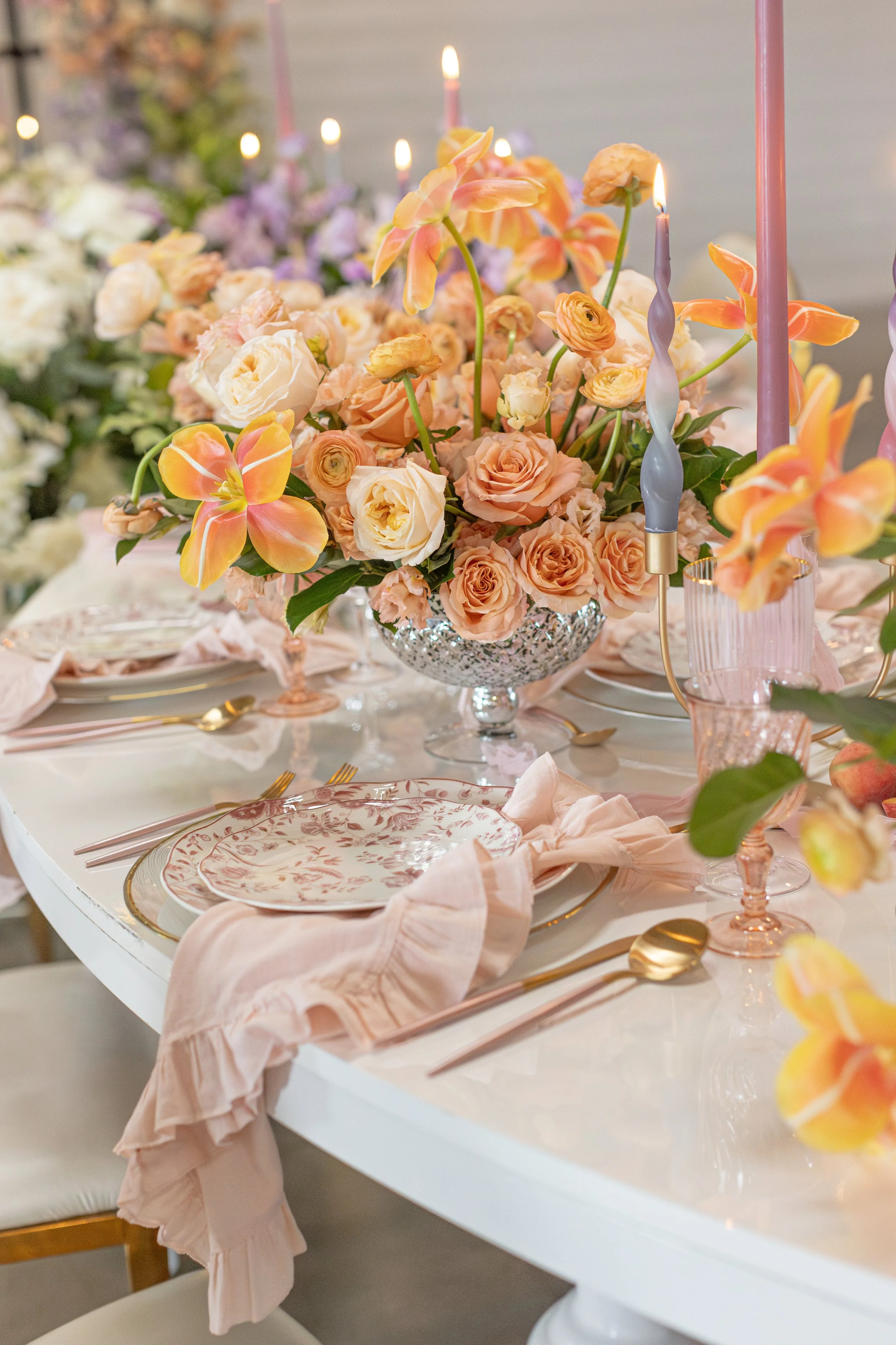 Monochromatic blocks of peach, lilac, pink, lime green, and yellow blooms filled a sweeping candle-lit table layered with fruit and gold compotes.